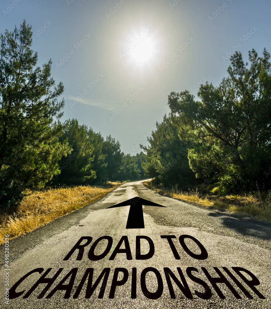 Road to championship text on asphalt forest road, victory concept photography. Vertical photo. No people.