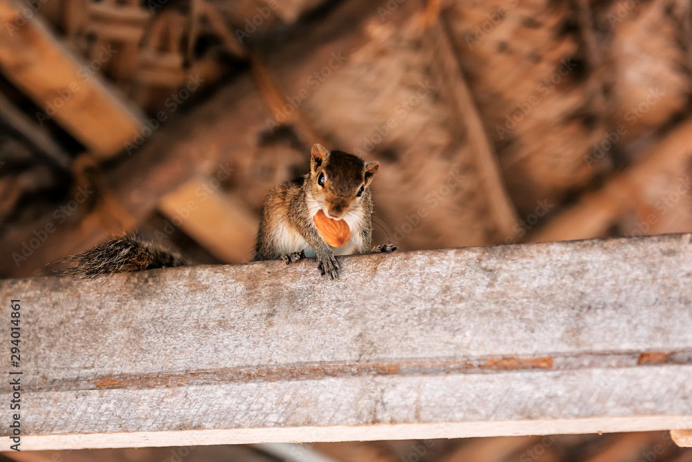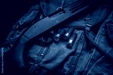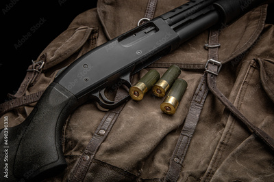 A black 12-gauge pump-action shotgun and ammo are on a canvas backpack. A smooth-bore weapon with a plastic stock. Dark back
