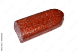 Hard smoked sausage on a white background.A stick of smoked sausage in the cut.Salami sausage background.