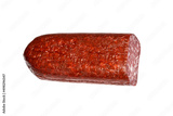 Hard smoked sausage on a white background.A stick of smoked sausage in the cut.Salami sausage background.