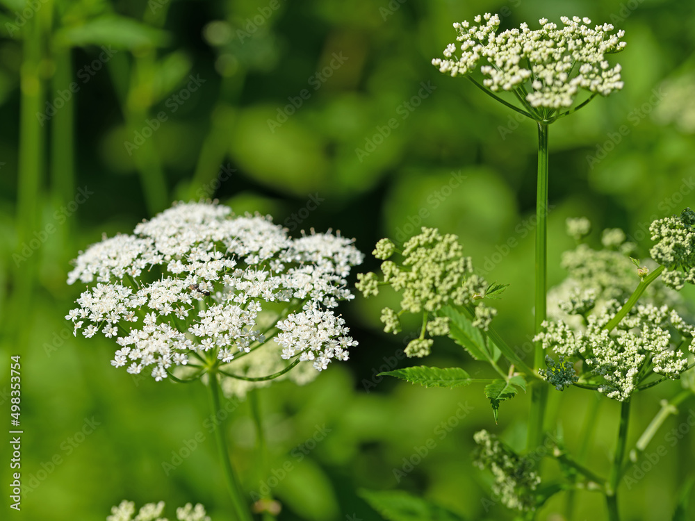 Blühender Giersch ,Aegopodium podagraria, im Frühjahr
