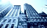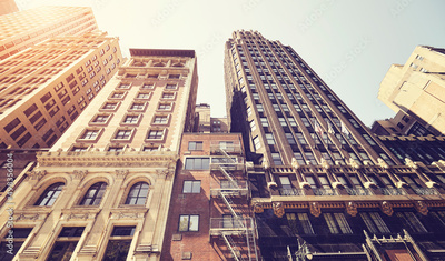 Looking up at old Manhattan buildings against the sun, color toned picture, New York City, USA.