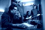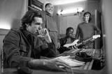 Side view portrait of music band composing new album in professional recording studio, focus on male producer in foreground