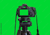 Dslr camera with empty screen on the tripod, isolated on green background. Green screen camera.