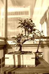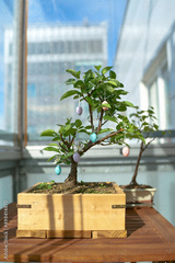 mit Ostereiern dekorierter Bonsai auf einem Tisch auf dem Balkon