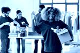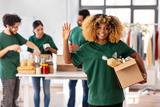 charity, donation and volunteering concept - happy smiling female volunteer with food in box waving hand over and international group of people at distribution or refugee assistance center