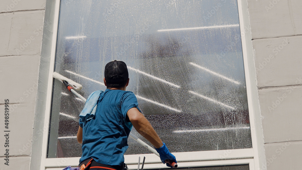 An employee of a professional cleaning service in overalls washes the glass of the windows of the facade of the building. Showcase cleaning for shops and businesses