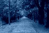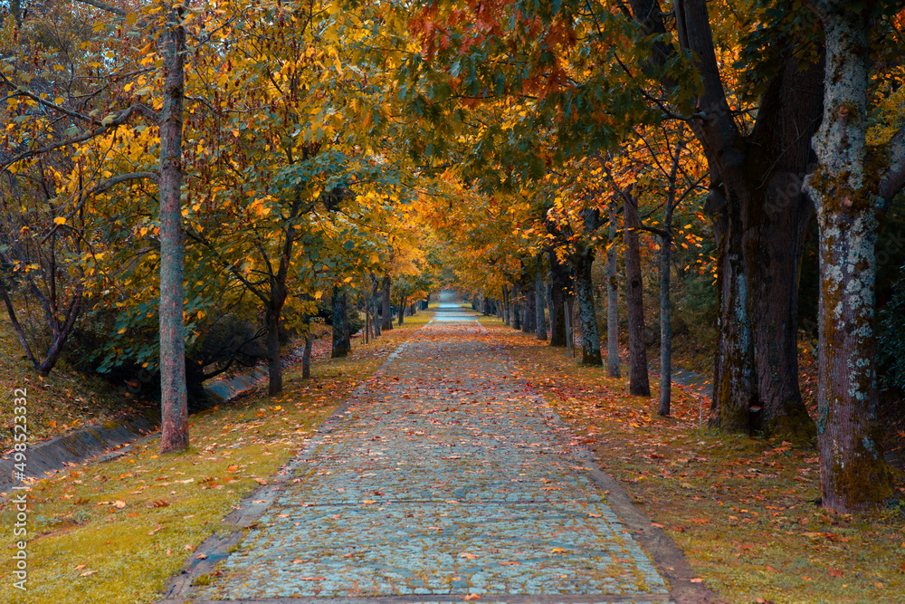 Autumn scene. A road in the forest with fallen leaves in fall season