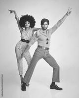 Lets dance. An attractive young couple standing together in retro 70s clothing.