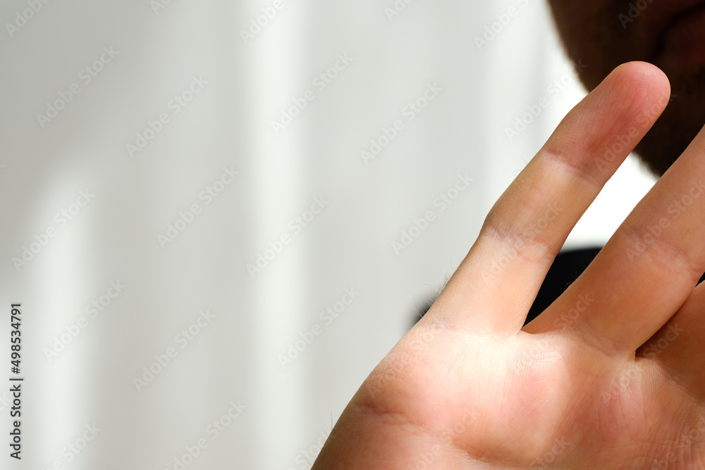 Help needed. Woman needs help concept on white background. Empty copy space for text messages. Violence, victim and sos idea with female hand or arm.