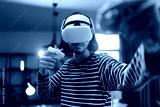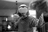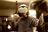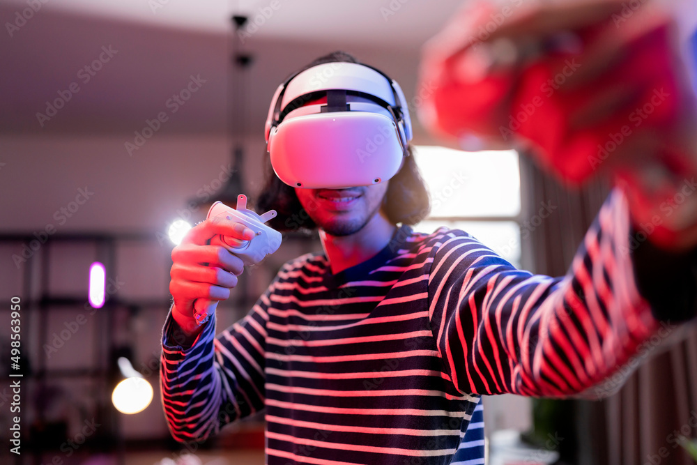 relax casual Asian adult Man Wearing Virtual Reality Headset and Holding Controllers Plays in a boxing sport Video Game at Home. Playing VR active sport game online in the Living Room