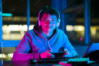 asian male esports gamer playing online sport leagues multiplayer game via smartphone with exited and cheerful emotion,asian male wear headset playing smartphone game online together with friends