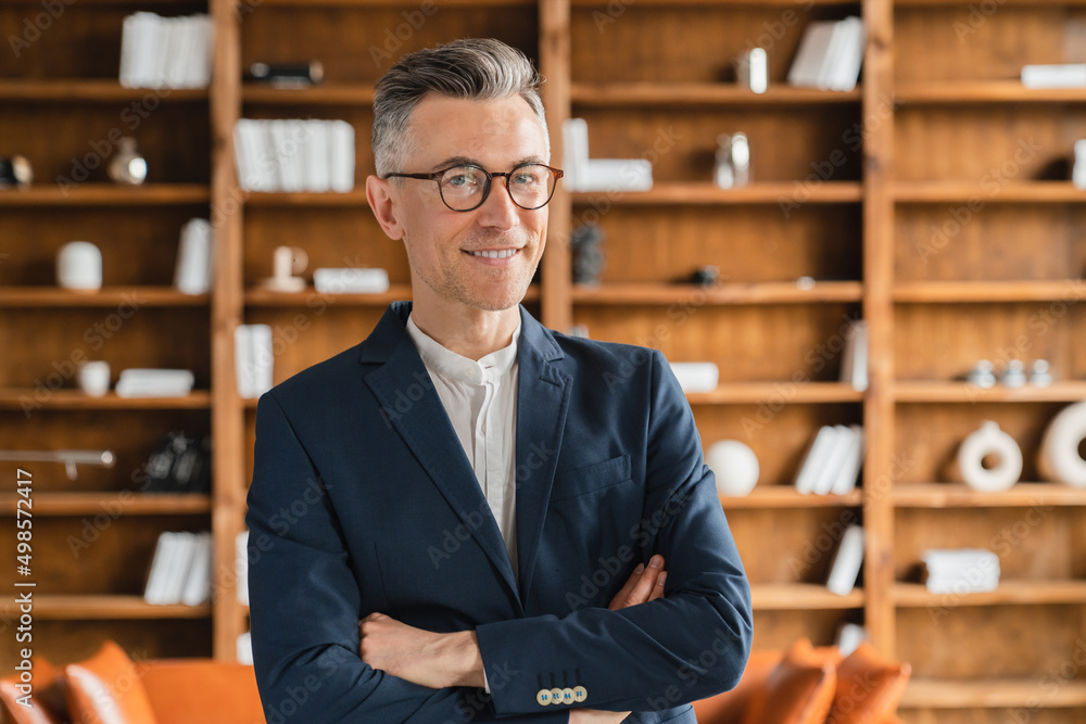 Confident successful caucasian mature middle-aged businessman freelancer financial adviser lawyer in formal clothes looking at camera with arms crossed in office work place