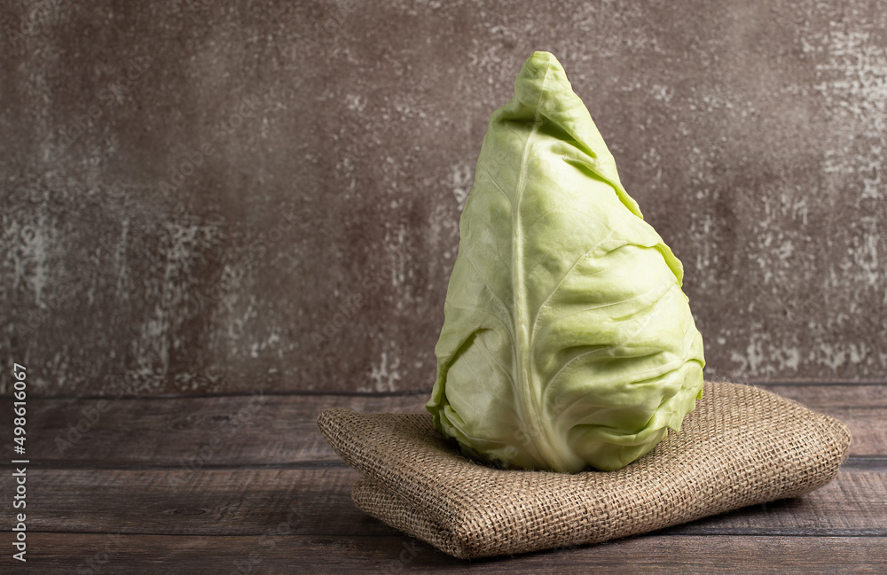 Cone head cabbage for dietary, vegan on a wooden background, sack, concept, stock photo