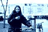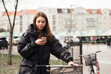 Young beautiful woman taking a bicycle by bike-sharing service and using application by phone outside on the street. Female student renting a bike