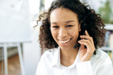 Portrait of a charming, friendly African American curly haired girl with headphones, call center operator, hotline worker, online consultant, wearing white shirt, looking at the camera, smiling