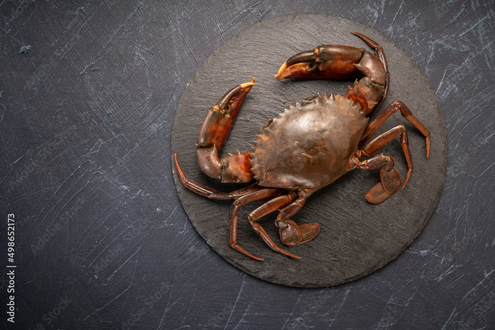 Raw black Crab on black plate, Fresh Raw mud crab on black plate on black background,