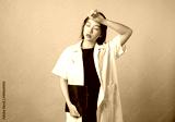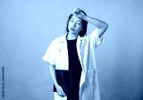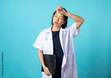 Exhausted young asian female doctor looking tired after shift in hospital, looking sad with fatigue, standing on blue background.