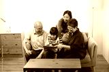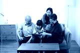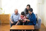 Smiling Asian grandparents on couch with granddaughter looking at tablet. happy three generation family spending time together at home.