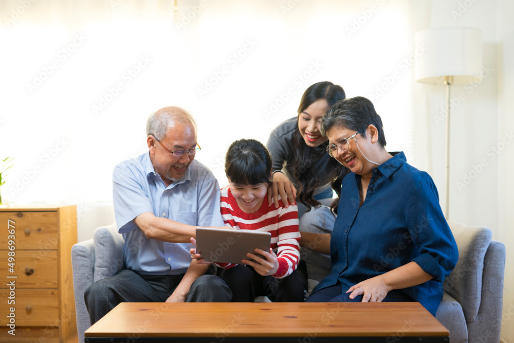 Smiling Asian grandparents on couch with granddaughter looking at tablet. happy three generation family spending time together at home.