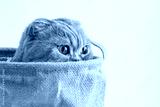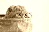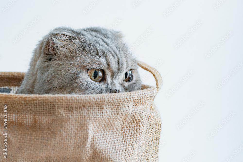 striped gray mischievous kitten tricky looks out of the bag with its eyes on a white background.