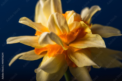 Narcissus on a dark blue background. Close-up. Shallow depth of field.