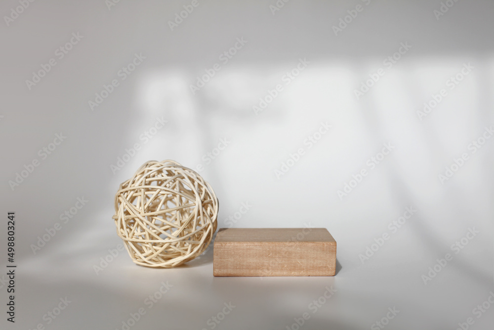 Wooden eco rustic wood board platform podium on white light and shadow copy space background. Minimal empty display product presentation scene.
