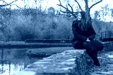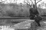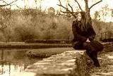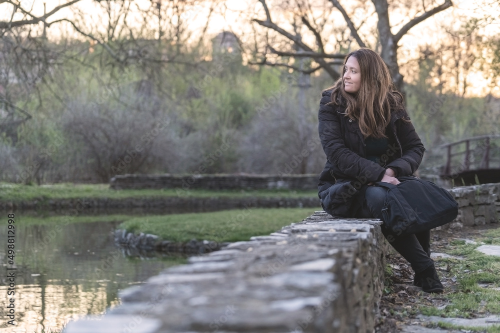 A woman sits on the wall near the lake