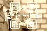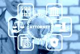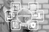 Concept of attorney and law. Court of justice and law trial. Lawyer using virtual touchscreen presses attorney word.
