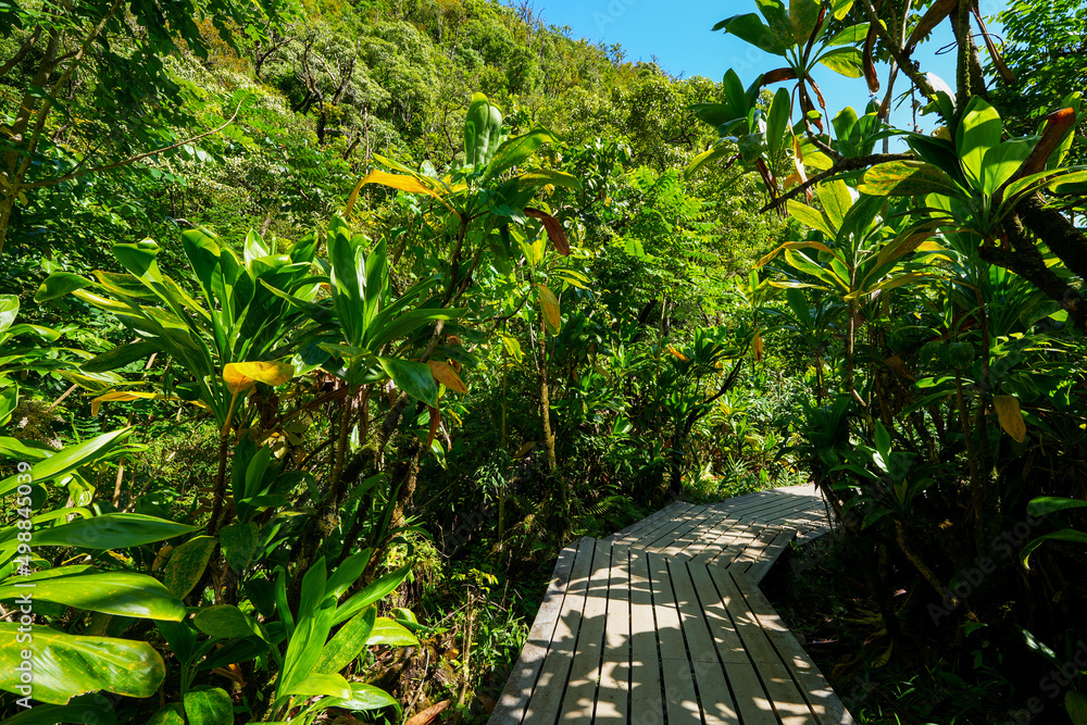 Boardwalk in the rainforest of the Pipiwai Trail in the Haleakala National Park on the road to Hana, east of Maui island, Hawaii, United States