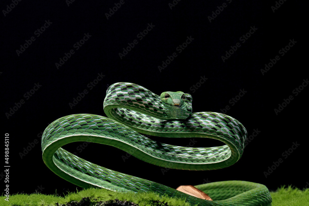ahaetulla prasina snake ready to attack, green snake, animal closeup