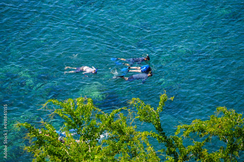 Snorkelers in Honolua Bay along the Honoapiilani Highway in the west of Maui island in Hawaii, United States