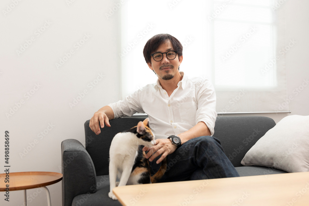 Asian man relax with cats on the sofa at home.