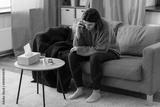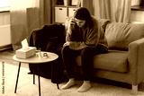 mental health, psychological help and depression concept - stressed woman with sedative medicine on table calling on phone at home