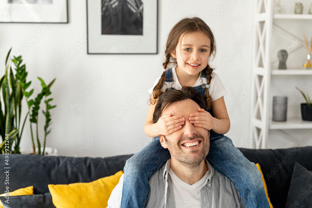 Cute girl closed eyes to her father. Loving father carrying his little toddler daughter on the shoulders sitting on the sofa in cozy living room, single parent playing with kid at home