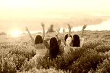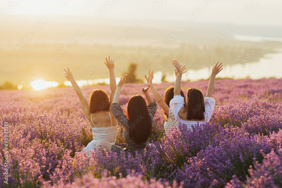Beautiful girlfriends having picnic in the lavender field in summer sunset. They sitting with hands up and enjoying beautiful landscape.