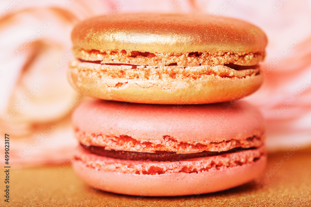 Tender french cookies macaron on golden backgrouns