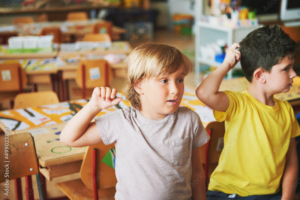Two concentrated 4-5 year old boys in classroom, preschool children