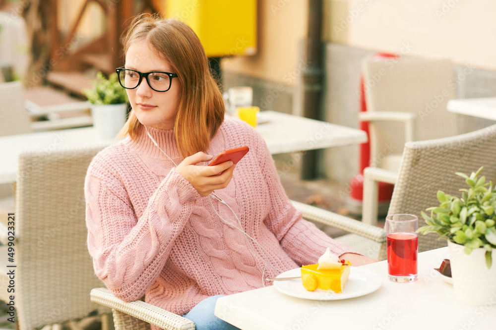 Outdoor portrait of cute young teen girl resting in cafe, listening music or podcast