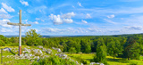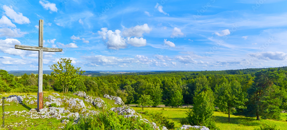 Schöner Blick auf das Nördlinger Ries, mit einem Gipfelkreuz, in Bayern, Deutschland,