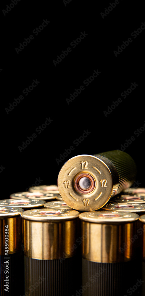 Shotgun shells on a black reflective surface. Ammunition for 12 gauge smoothbore weapons. Hunting ammunition. Dark back.