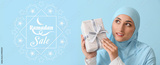 Young Muslim woman with gift and text RAMADAN SALE on light blue background