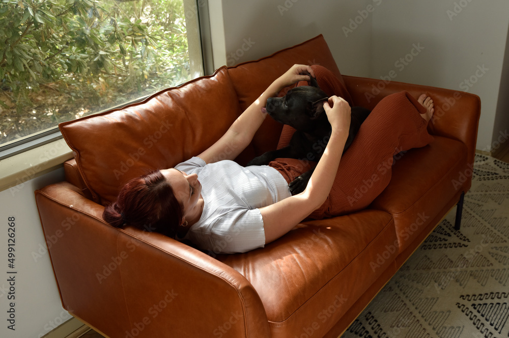 full length portrait o red haired girl wearing casual clothes, relaxing on comfortable leather couch in living room home setting.