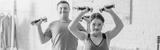 Teenager with down syndrome training with dumbbells near friend at home, banner.