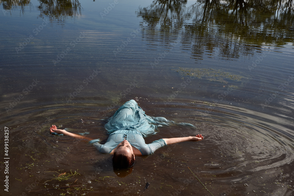 Portrait of beautiful girl wearing flowing fantasy gown in a magical lake background.
