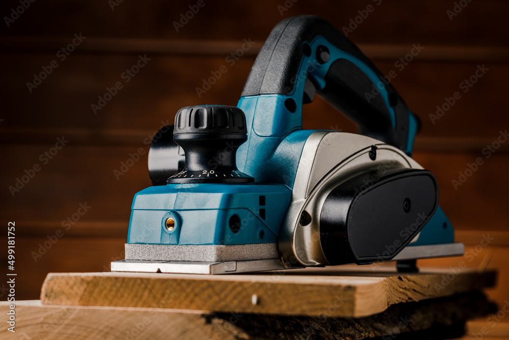 Manual electric plane on an untreated log of a tree. Wooden products. Production of wood products.