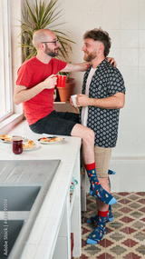 Two gay men in the kitchen drinking coffee