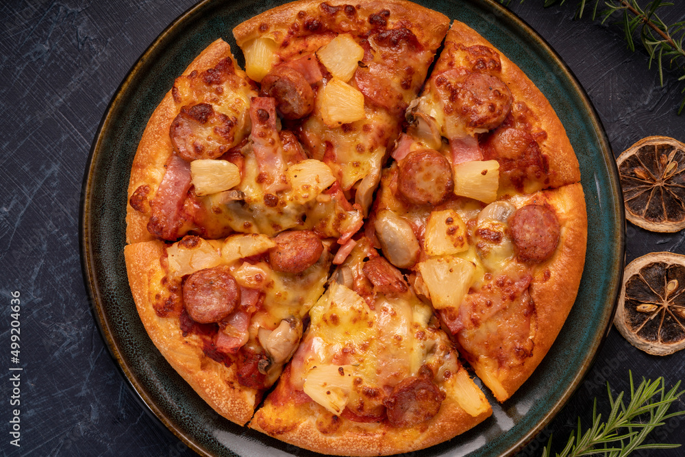 Mushroom and Sausage Pizza with cheese on black plate, Mushroom and Sausage Pizza on black plate on black background.