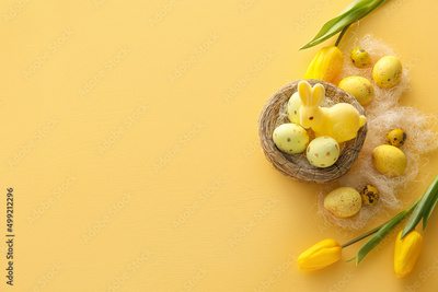 Nest with painted Easter eggs, tulip flowers and bunny on yellow background