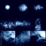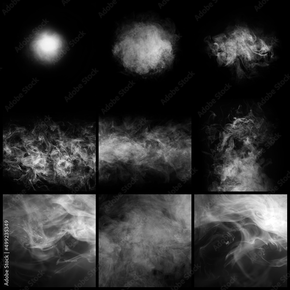 Smoke over black background. Fog or steam abstract texture collage. Set collection.